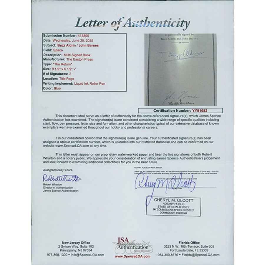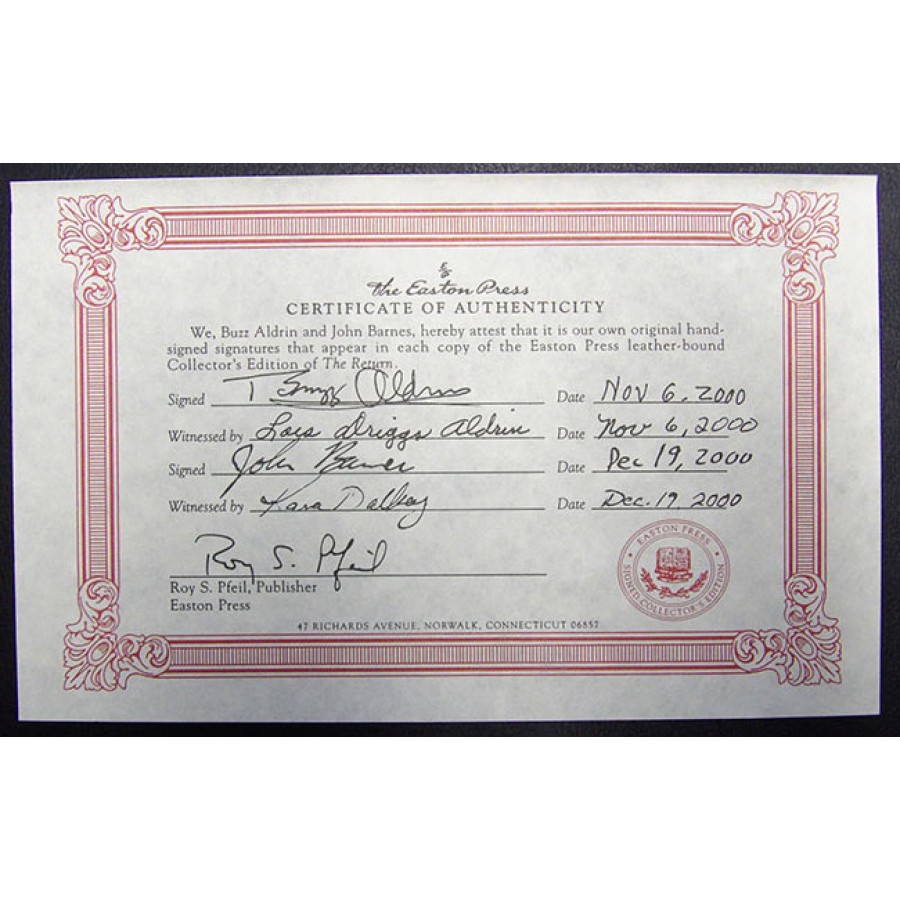 Signed The Return by Buzz Aldrin and John Barnes hardcover book from the Easton Press. This item is certified by James Spence Authentication (JSA) with sticker affixed to item and matching latter of authenticity. This also comes with it's original paperwork and certificate of authenticity from the Easton Press.