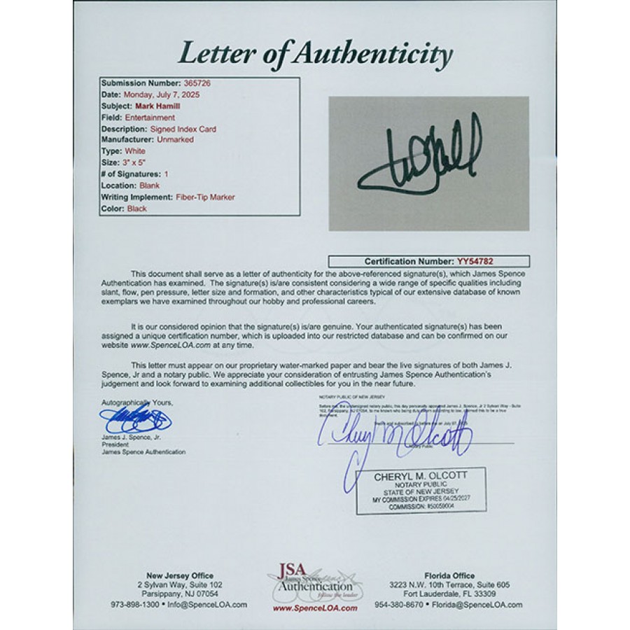 Signed Mark Hamill 3x5 index card in black sharpie. This item has been certified by James Spence Authentication (JSA) with sticker affixed to item and matching letter of authenticity.