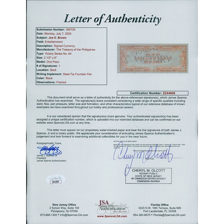 Signed Joe E. Brown Philippines One Peso Bill in black ink. This item has been certified by James Spence Authentication (JSA) with letter of authenticity.