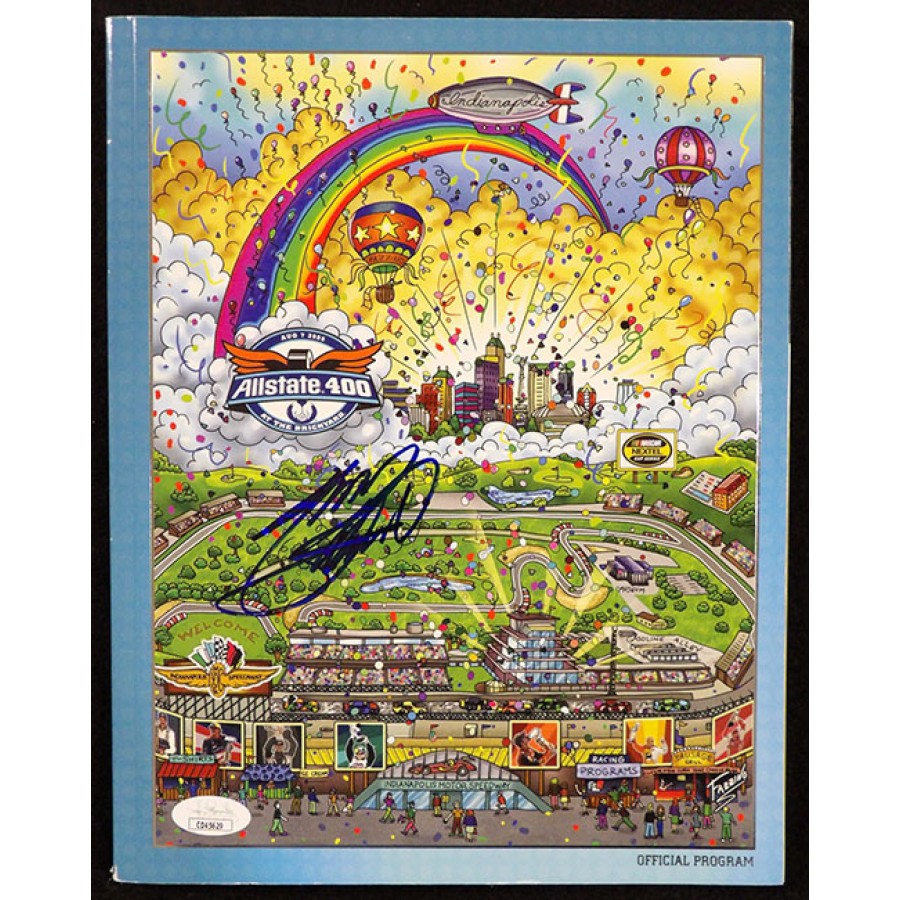 Signed Tony Stewart Allstate 400 2005 official souvenir program in blue sharpie on the cover. This item is certified by James Spence Authentication (JSA) with sticker affixed to item and matching card.