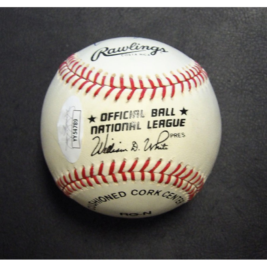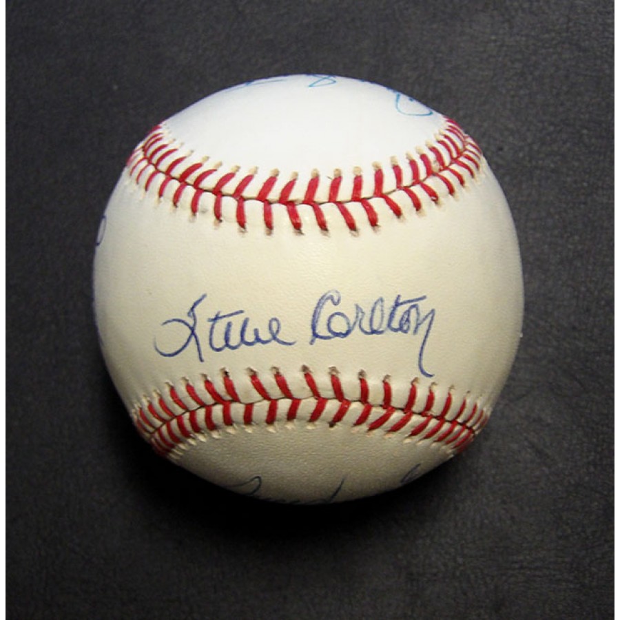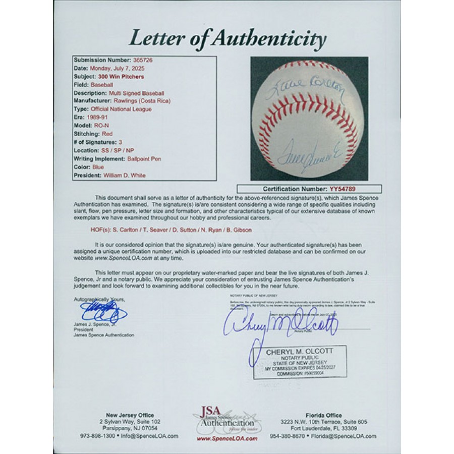 Signed 300 Winning pitchers Steve Carlton, Tom Seaver, Don Sutton, Nolan Ryan and Bob Gibson official Rawlings National League Baseball in blue pen by all 5. The ball has some light toning/spotting to it and the Gibson has fading to it. This item has been certified by James Spence Authentication (JSA) with sticker affixed to item and matching letter of authenticity.