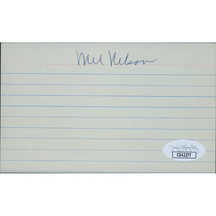 Signed Mel Nelson 3x5 index card in blue ink. This item has been certified James Spence Authentication (JSA) with sticker affixed to item and matching card.