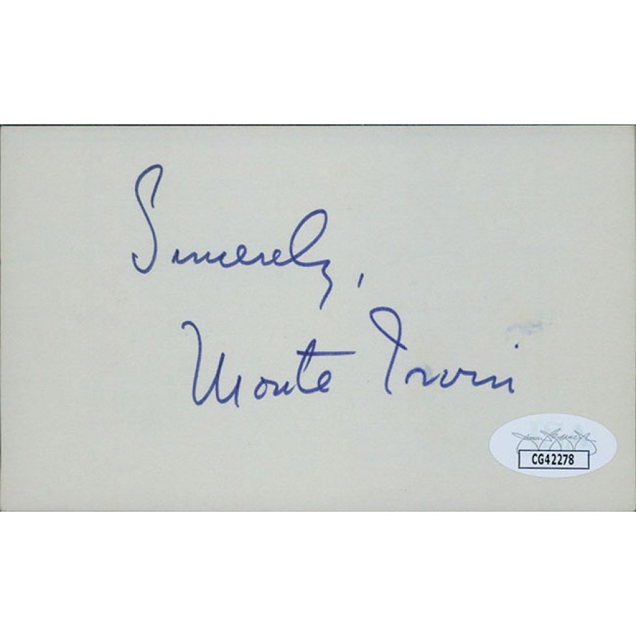 Signed Monte Irvin 3x5 index card in blue ink. This item has been certified James Spence Authentication (JSA) with sticker affixed to item and matching card.