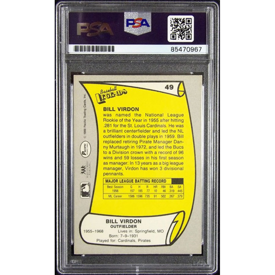 Signed Bill Virdon Pittsburgh Pirates 1988 Pacific Trading Baseball Card #49 in blue ink. This item is certified by Professional Sports Authenticator (PSA) encapsulated.