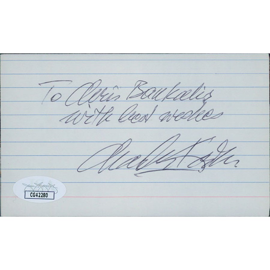 Signed Charles Korvin 3x5 index card in blue ink personalized. This item has been certified by James Spence Authentication (JSA) with sticker on item and matching card.