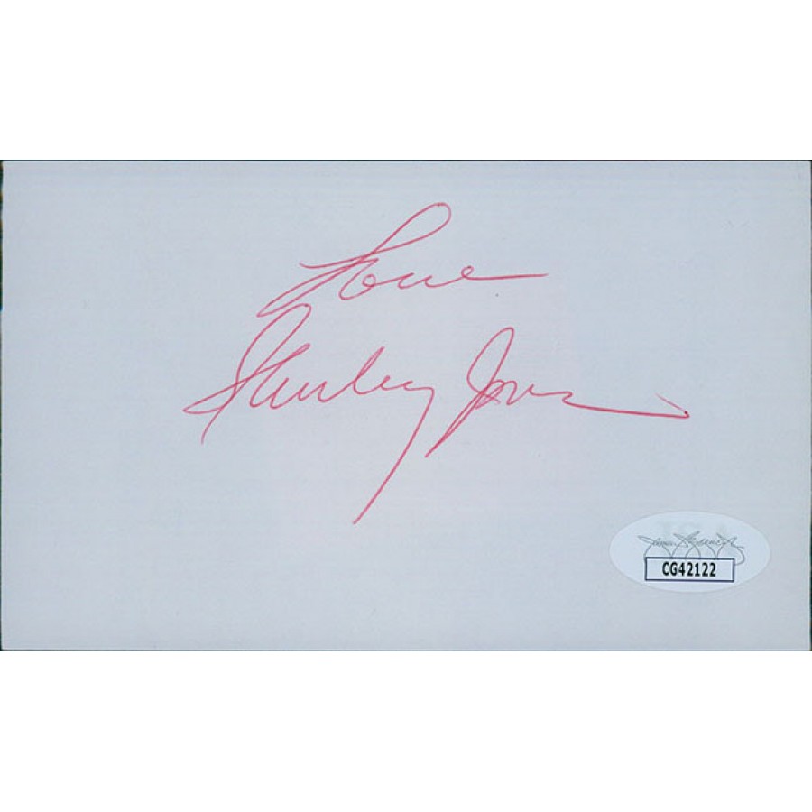 Signed Shirley Jones 3x5 index card in red ink. This item has been certified by James Spence Authentication (JSA) with sticker on item and matching card.