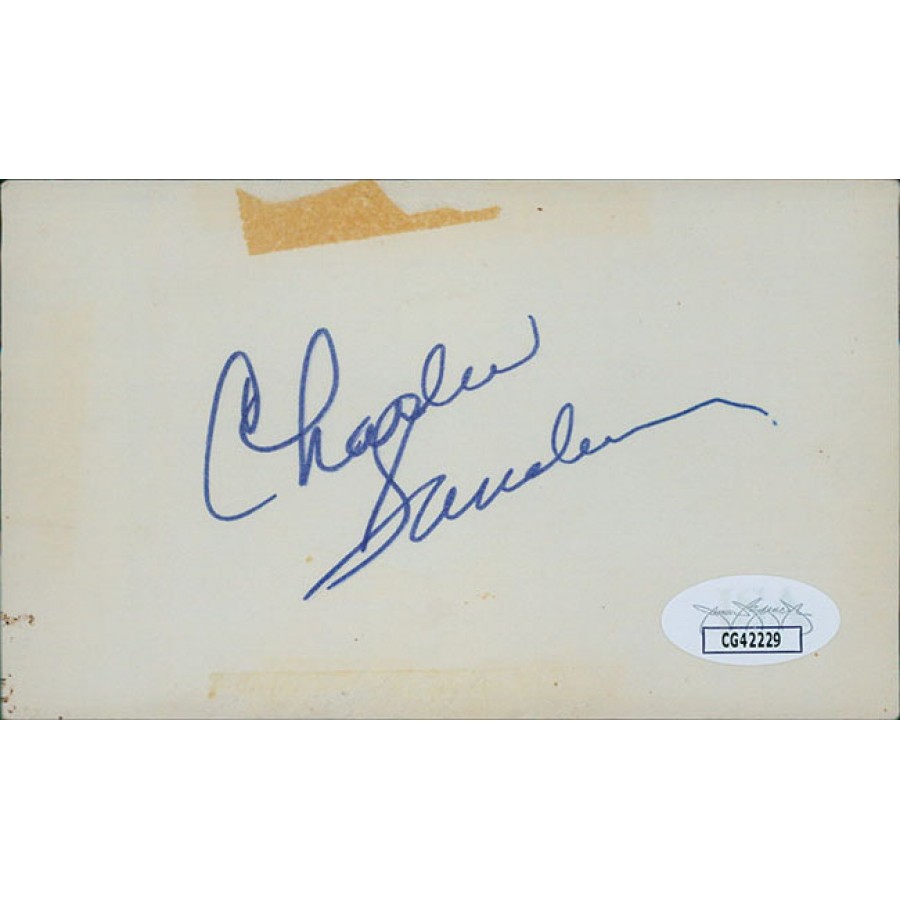 Signed Charlie Sanders 3x5 index card in blue ink. This item has been certified by James Spence Authentication (JSA) with sticker affixed to item and matching card.