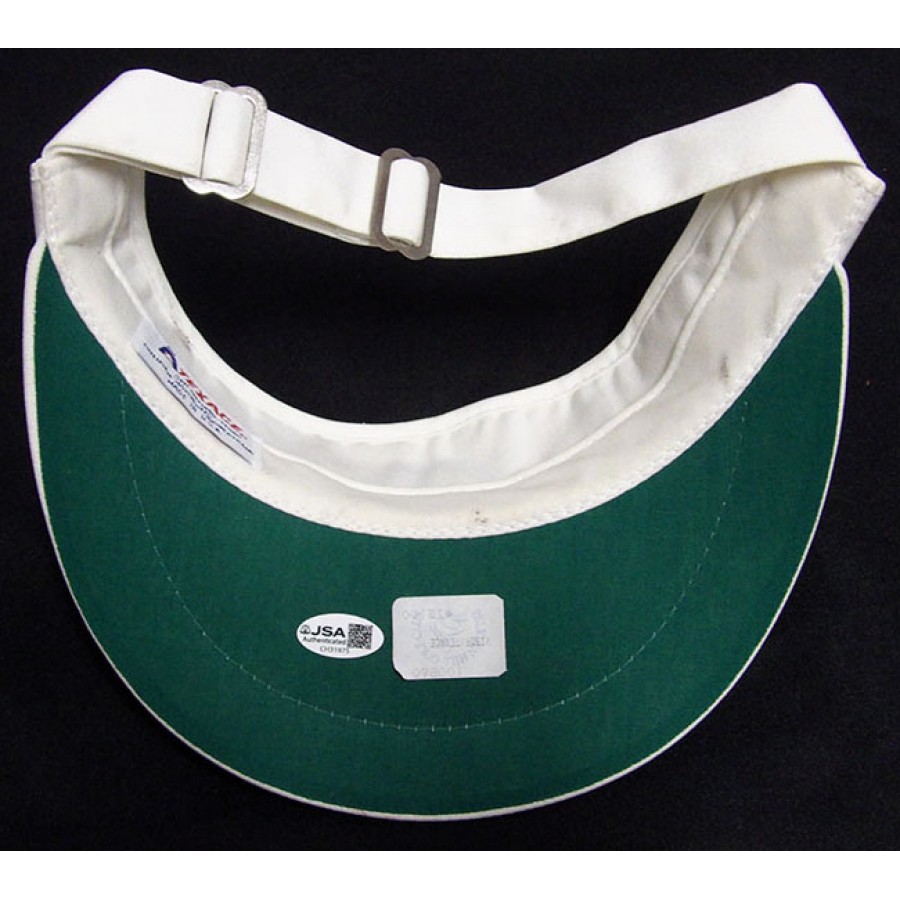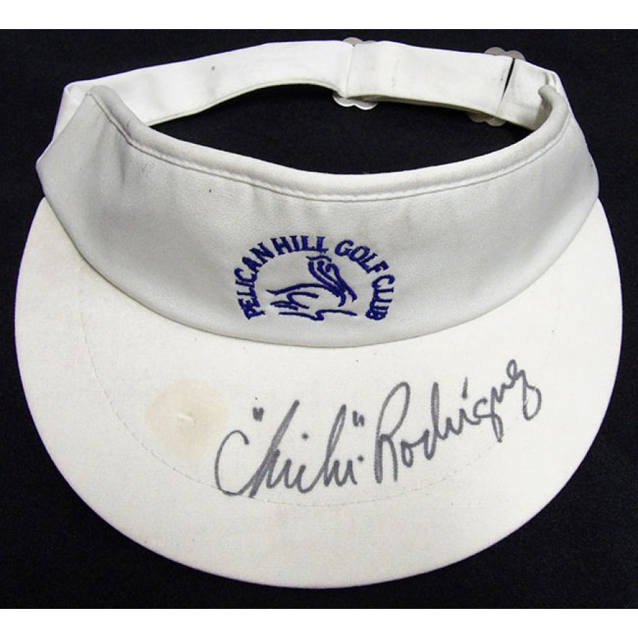 Signed Chi Chi Rodriguez Pelican Hill Golf Club visor in black sharpie on the top bill. The visor has wearing with dirk marks. This item has been certified by James Spence (JSA) Authentication with sticker affixed to item and matching card.