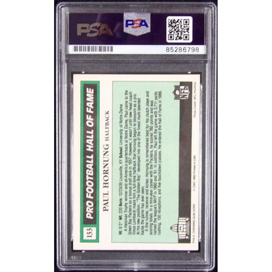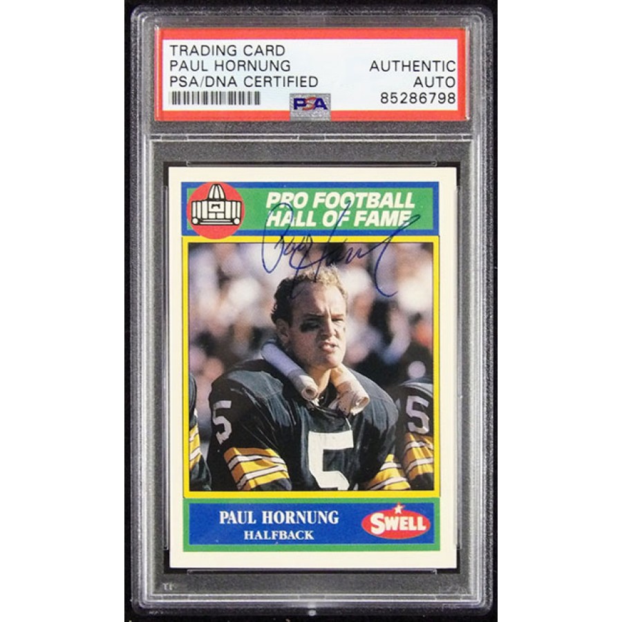 Signed Paul Hornung Green Bay Packers 1990 Swell Pro Football Hall of Fame football card #133 in blue pen. This item is certified by Professional Sports Authenticator (PSA) encapsulated.