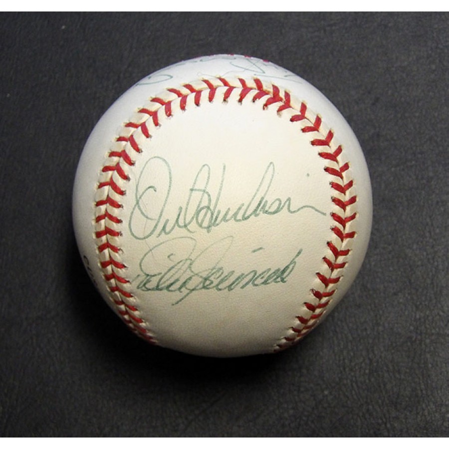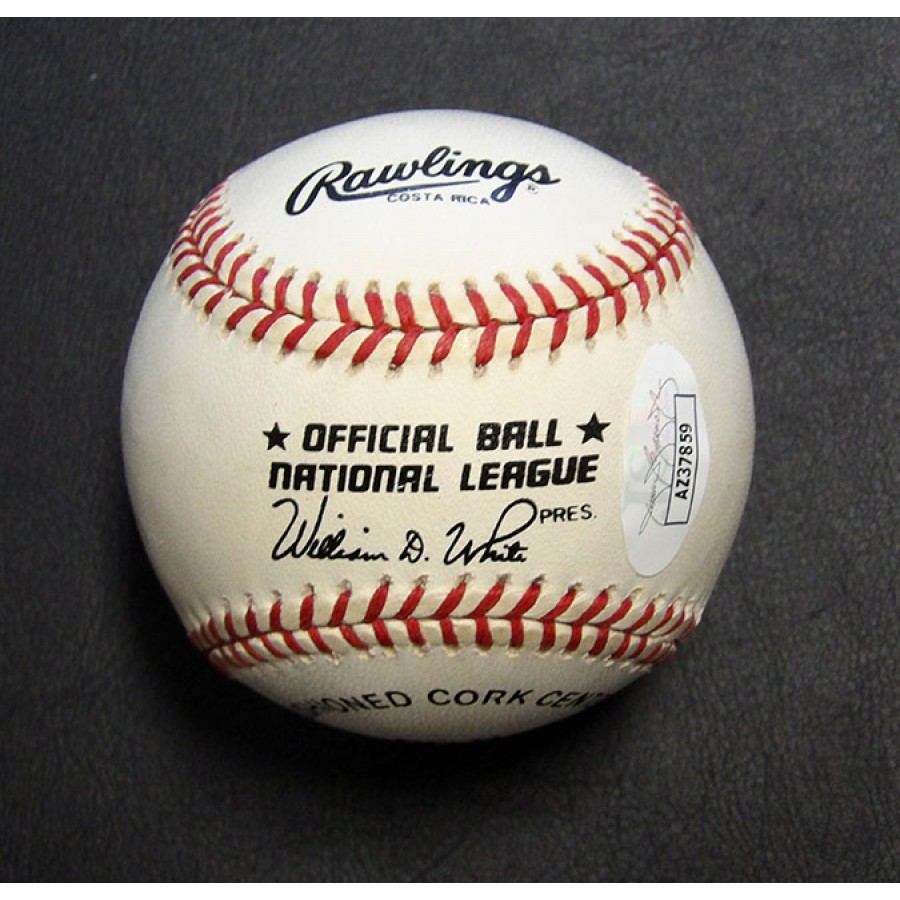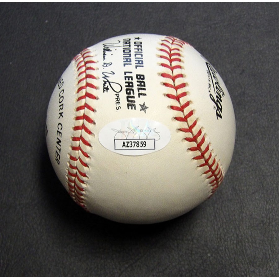 Signed Los Angeles Dodgers Tommy Lasorda Mike Scoscia and Orel Hershiser official Rawlings National League Baseball in black pen by all three on panels. The ball has some toning/spotting to it and the signature have turned greenish. This item has been certified by James Spence Authentication (JSA) with sticker affixed to item and matching card.