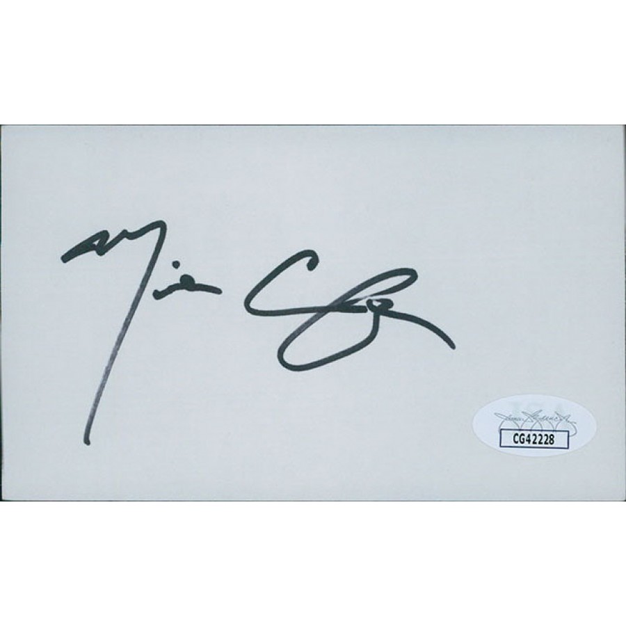 Signed Mike Cofer 3x5 index card in black sharpie. This item has been certified by James Spence Authentication (JSA) with sticker affixed to item and matching card.