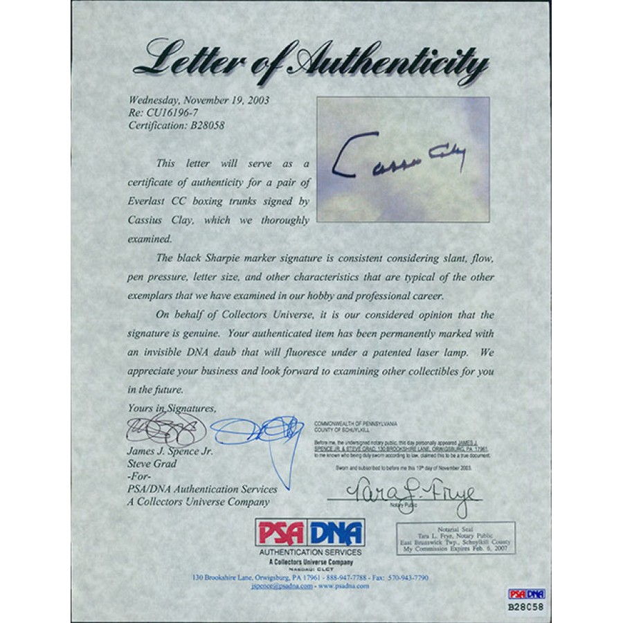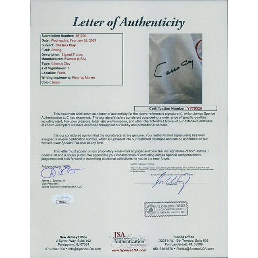 Signed Cassius Clay Everlast boxing trunks featuring a CC monogram in black sharpie. This item is certified by James Spence Authentication (JSA) with Letter of Authenticity. This is also certified by Professional Sports Authenticator (PSA) with letter of authenticity. Will also include an original photo from when they were signed.