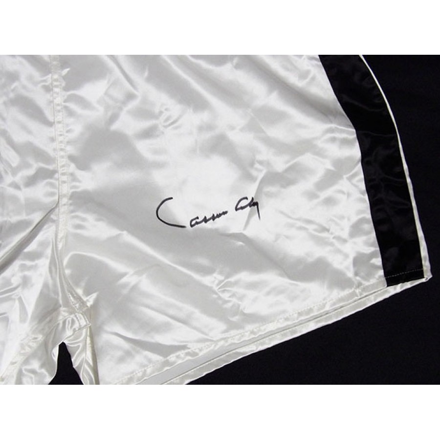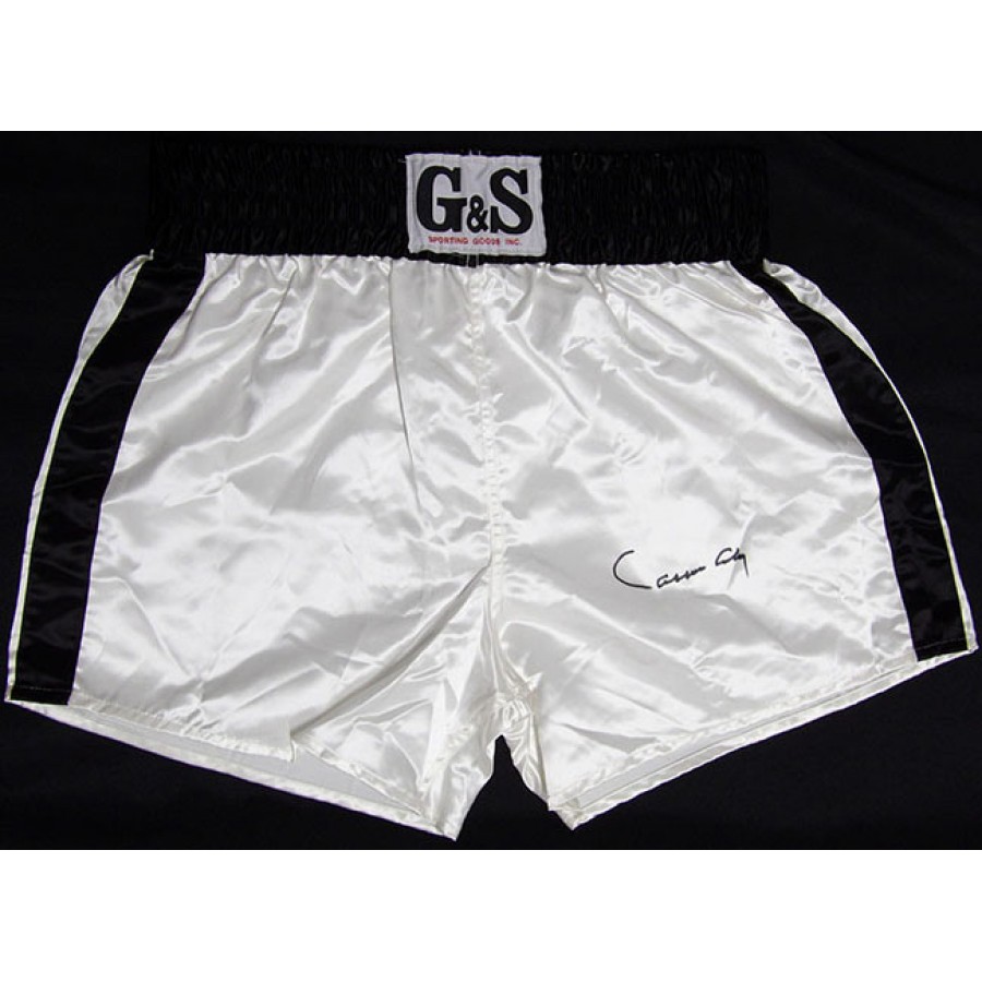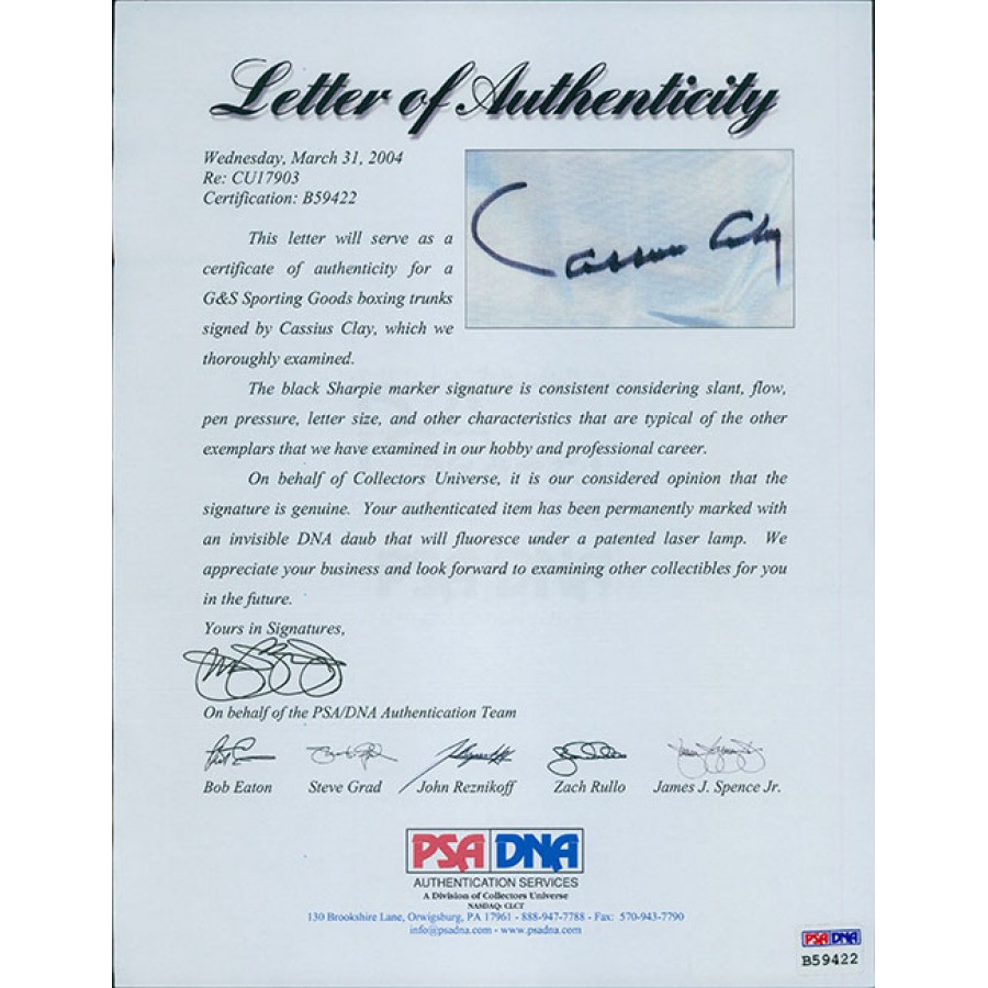 Signed Cassius Clay G&S Sporting Goods boxing trunks in black sharpie. This item is certified by This is certified by Professional Sports Authenticator (PSA) with letter of authenticity.