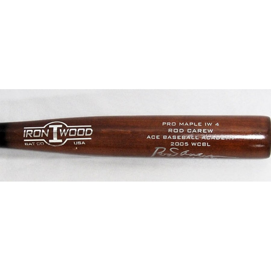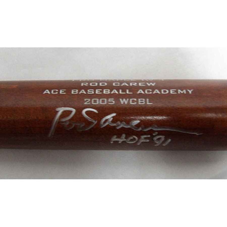 Signed Rod Carew Iron I Wood Ace Academy 2005 WCBL bat in silver sharpie with "HOF 91" inscription. This item has been certified by James Spence Authentication (JSA) and comes with a sticker affixed to the item and matching card.
