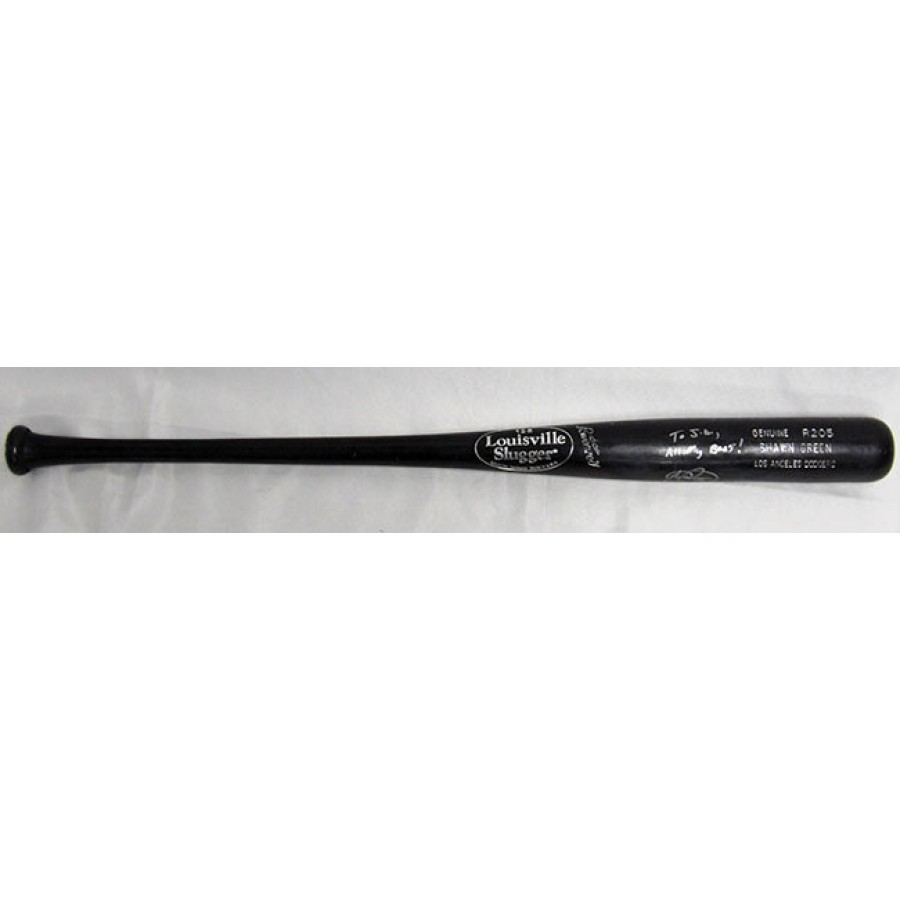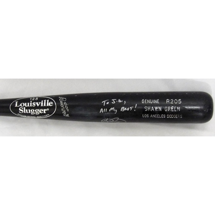 Signed Shawn Green game used Louisville Slugger bat in silver sharpie personalized "To JD". This item has been certified by James Spence Authentication (JSA) with sticker affixed to item and matching card.